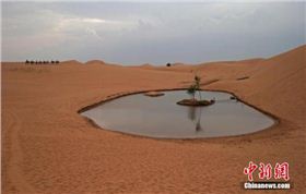 資料圖:騰格里沙漠深處,一處洼地有一處神奇的小湖泊,被開發成旅游景點,