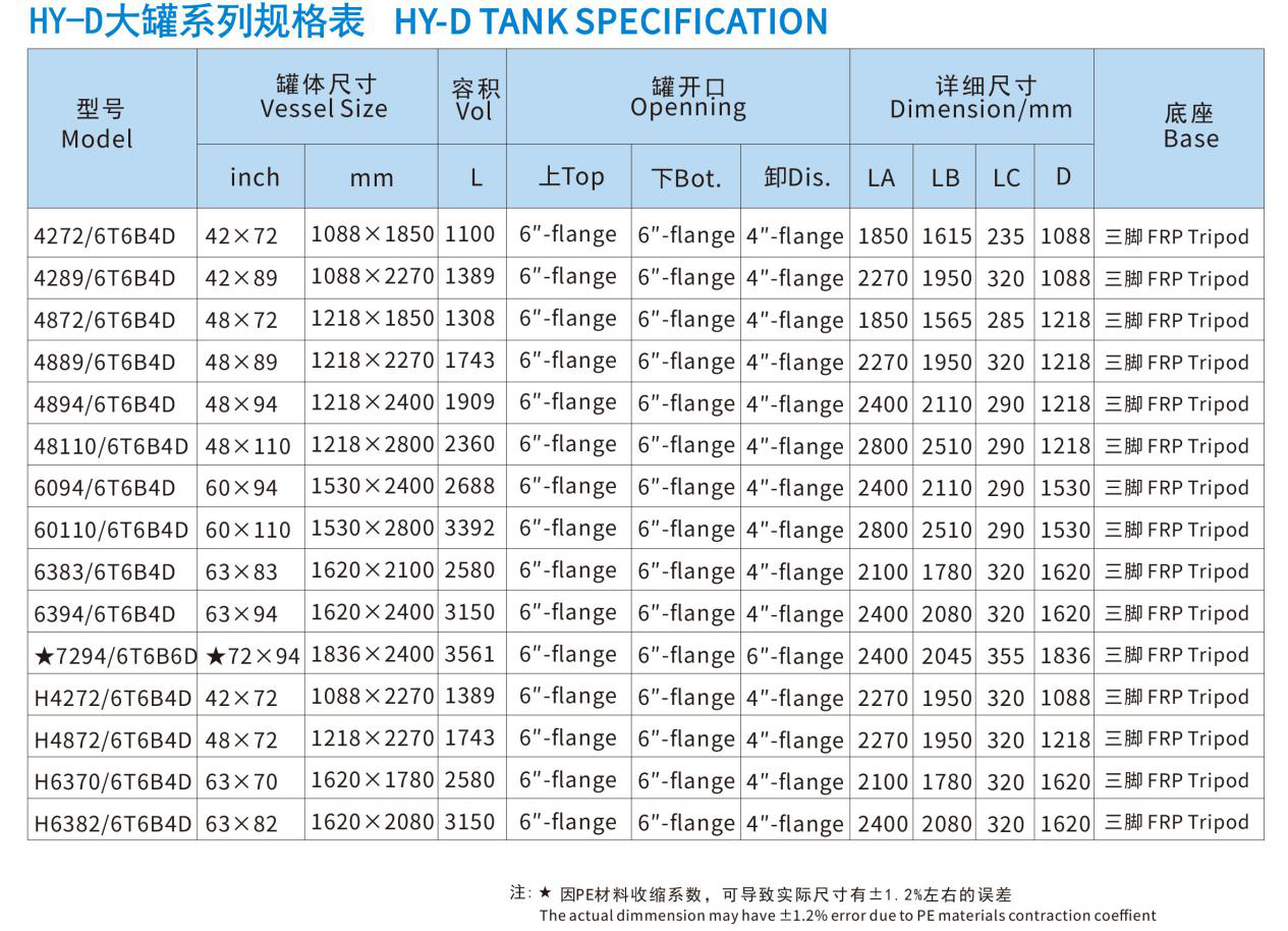 ?華宇玻璃鋼罐共有四大系列,分別為HY-S小罐系列、HY大罐系列、HY-H大罐系列及HY-D大罐系列。其中,HY-D大罐系列為帶卸料口的罐體,在底座上方的弧形段處設有卸料口。