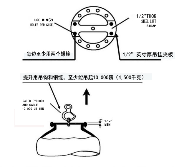 用客戶自備的厚度1/2英寸(12.7mm)的鋼制吊掛裝置與法蘭連接,每邊至少連接兩個螺栓。見下圖。然后用吊鉤和鋼纜(至少能承受10000磅;4500千克)吊裝。